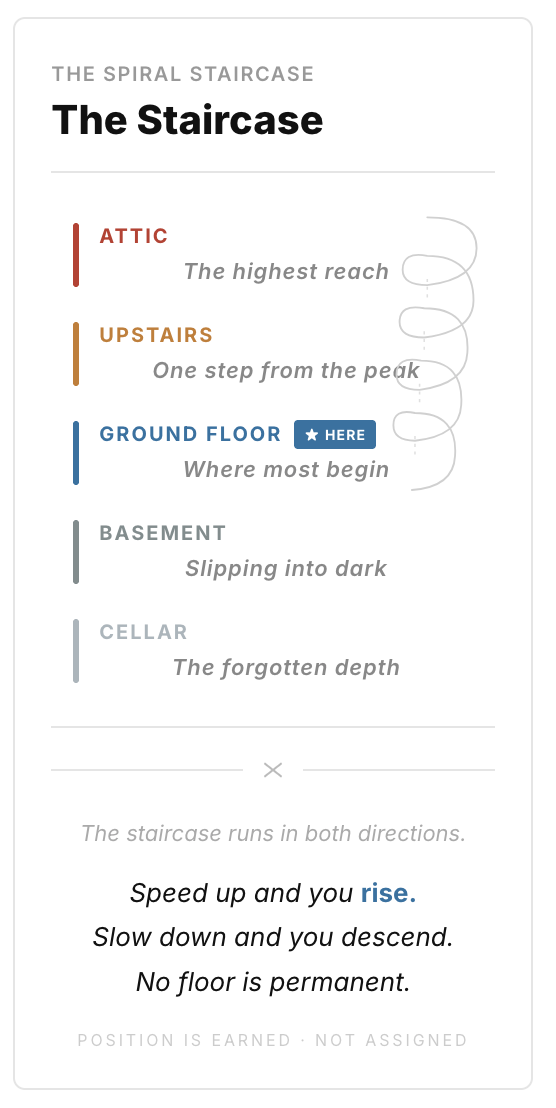 The Ground floor offers something different — quieter, less immediate, but I believe more durable. The feeling of having chosen well under pressure. The slow accumulating satisfaction of making real progress toward something that genuinely matters. The particular quality of being the author of your own actions rather than simply their passenger. It is less loud than the spiral. But once a person has really experienced what the Ground floor offers — not as an idea but as a felt reality — the pull of the spiral begins, gradually, to lose some of its authority.