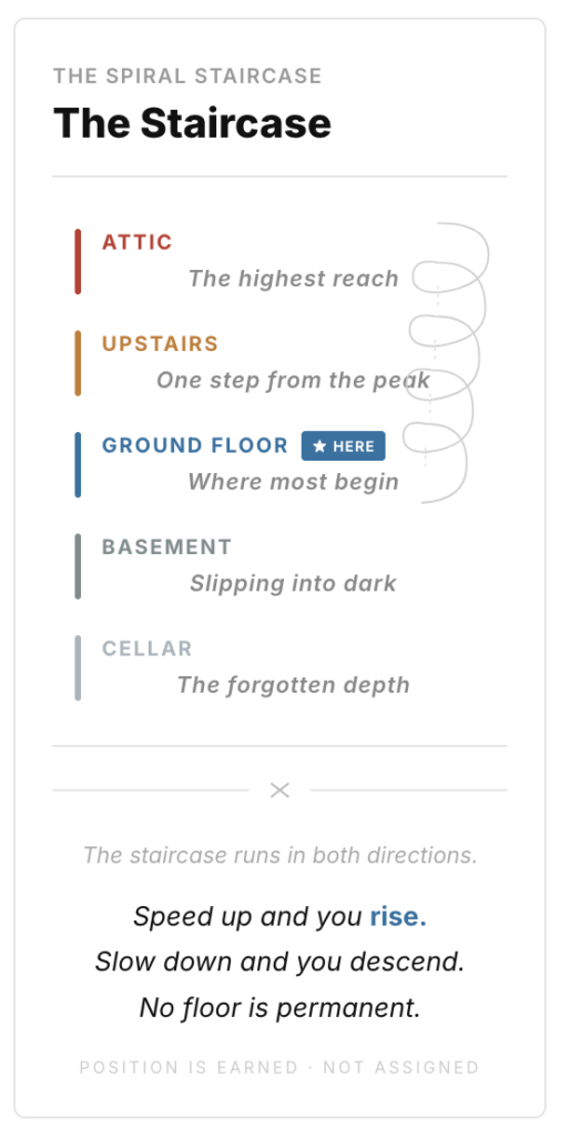 On the Ground floor the staircase does not spin. Here we are not spiralling up or down. We are focused on what we value, on our purpose in this moment, and in any interaction with another person.